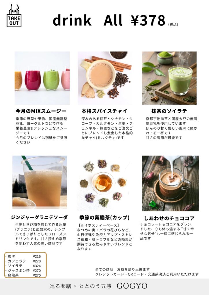 薬膳茶、スパイスたっぷりのドリンク、季節のスープ、甘味やサイドメニューまで